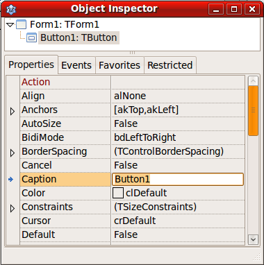 3. Object Inspector/Properties: In this page of the Object Inspector, we can view and modify any component's properties, like a Button's caption or location, a form's color, or a labels font, etc.