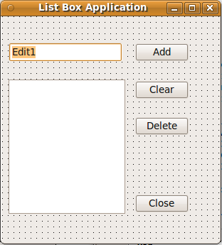 Clicking the Add button will insert the text of the edit box into the list. The Delete button will delete current selected list item. The Clear button will clear the entire list. Finally, the Close button will close the application.