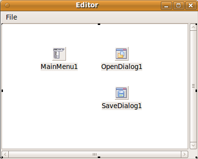 Double click on the MainMenu1 component and add File menu and a sub menu containing Open File, Save File, and Close menu items.