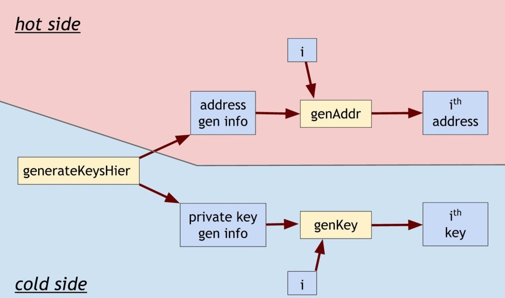 Figure 4.2: Schema of a hierarchical wallet. The cold side creates and saves private key generation info and address generation info. It does a one-time transfer of the latter to the hot side. The hot side generates a new address sequentially every time it wants to send coins to the cold side. When the cold side reconnects, it generates addresses sequentially and checks the block chain for transfers to those addresses until it reaches an address that hasn’t received any coins. It can also generate private keys sequentially if it wants to send some coins back to the hot side or spend them some other way.