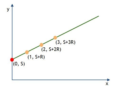 and so on. The secret corresponds to the point x=0, y=(S+0*R) mod P, which is just x=0, y=S.
