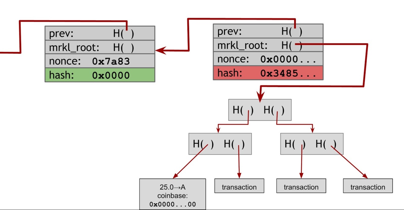 Is everyone solving the same puzzle? You may be wondering: if every miner just increments the nonces as we described, aren’t all miners solving the exact same puzzle? Won’t the fastest miner always win? The answer is no! Firstly, it’s unlikely that miners will be working on the exact same block as each miner will likely include a somewhat different set of transactions and in a different order. But more importantly, even if two different miners were working on a block with identical transactions, the blocks would still differ. Recall that in the coinbase transaction, miners specify their own address. This change will propagate up causing all the Merkle hashes to change ensuring that no two miners are hashing the same inputs. |