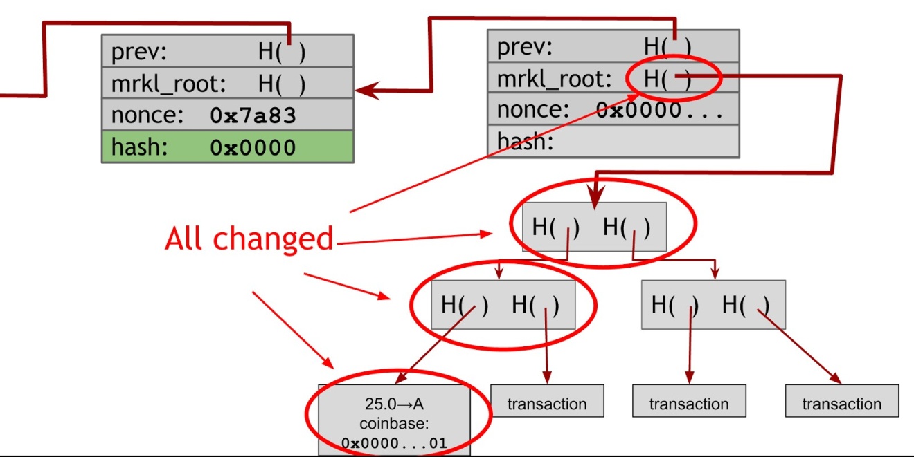 Figure 5.2: Changing a nonce in the coinbase transaction propagates all the way up the Merkle tree.