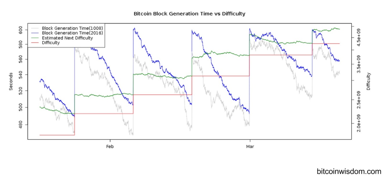 Even though the goal was for a block to be found every ten minutes on average, it's actually close to about every nine minutes, and at the end of the two week cycle it will get down to around eight minutes. This behavior is during a period of rapid hash rate increase. If the hash rate isn’t increasing as fast, the average time to find a block will be more stable.