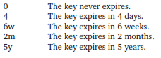 The key may have an expiry that ranges from days until years, or simply not have any expiry at all. To create a key with expiry just follow the example below: