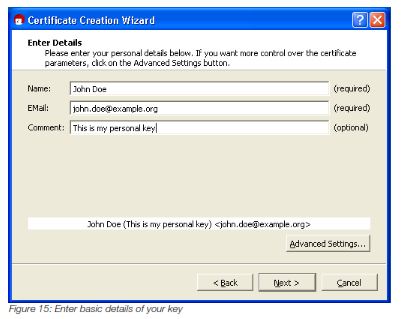 Here you will enter your basic personal details which will be part of your key and will be visible to anyone who has your key. The name and email address are required, while the comment is optional. When you are done click on Advanced Settings button.