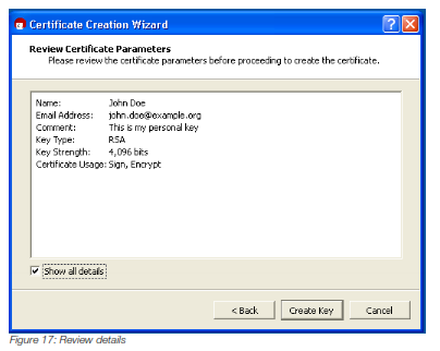 Review all details that will be part of your key. If you would you like to change anything just click on the Back button, otherwise click on Create Key button to create your key.