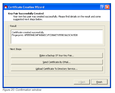 A confirmation window will show up showing your key's fingerprint, which is a unique code that only this key in the world has. When you send your public key to other people, the only way they can be certain that the key they received is yours and was not twisted along the way is by confirming the key's fingerprint with you.