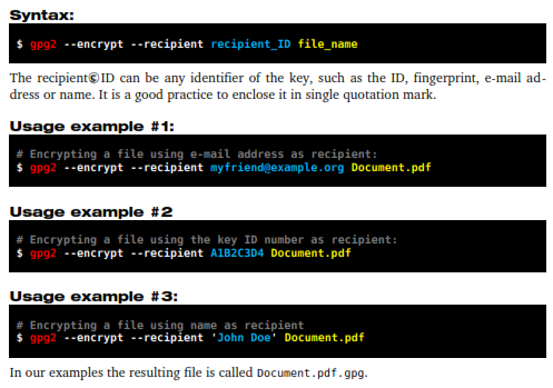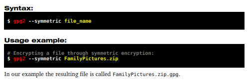 Encrypting and decrypting files is the main purpose of GnuPG, you can do it for yourself or for others. There are two ways to do it: using symmetric and asymmetric. Encryption.