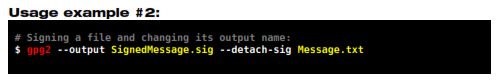 The output filename change also work with other GnuPG operations, such as signing, which is covered in the next chapter but can be seen in the example below: