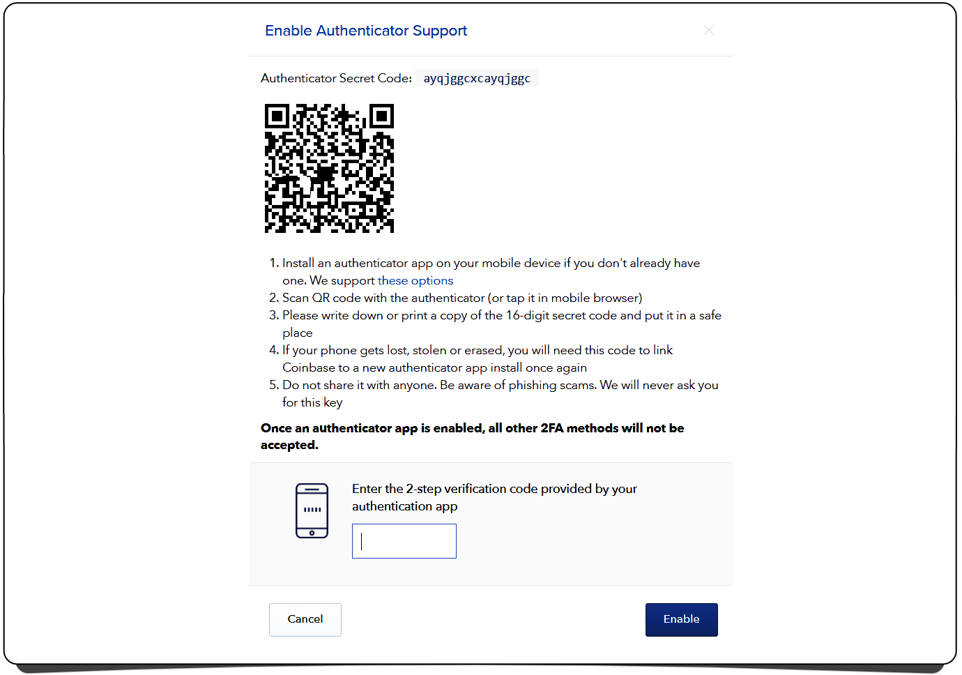 In Coinbase, enter the current code shown in Authy and press ‘enable’.
