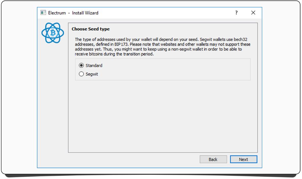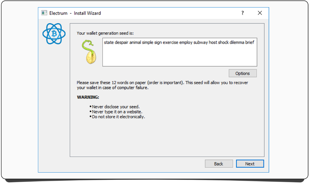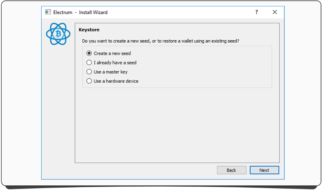 On this screen keep ‘Create a new seed’ selected. Press ‘Next’.