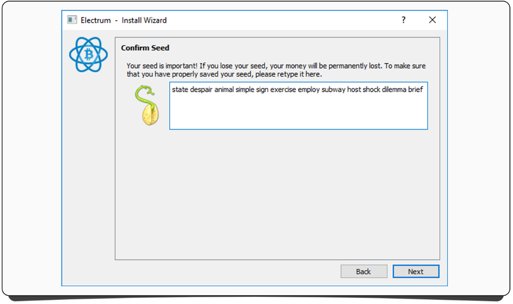 Note: If you forget your password, the only way to gain access to your coins will be using the seed you saved earlier.