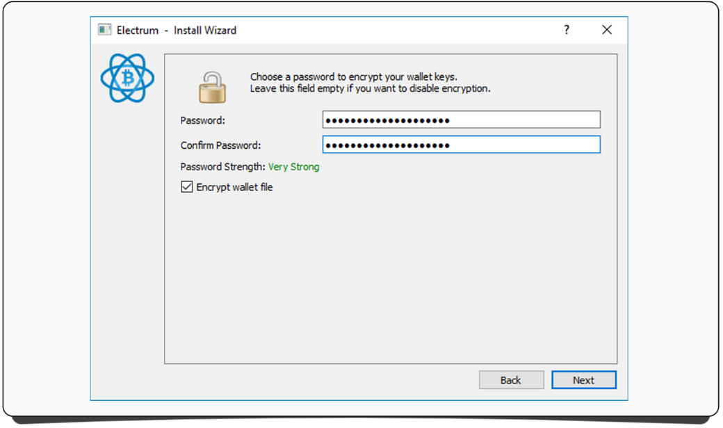 Keep ‘Encrypt wallet file’ checked. Press ‘Next’ twice.