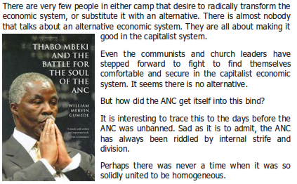 Worse, what the ANC stands for now cannot be explained or articulated in a revolutionary theory or vision that defines it outside the capitalist economic system. It is completely integrated into the unjust and unequal establishment.