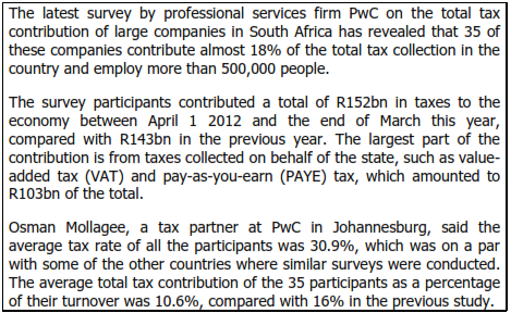 Exact calculations are not possible, but it can reasonably be accepted on the strength of the abovementioned grounds that the same people who are responsible for 33,7% of the state’s tax revenue by paying income tax are by far the main contributors in respect of other taxes as well. In other words: There is a strong, positive correlation between the amount of personal income tax and the amount of other tax a person pays.