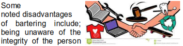 you are trading with, having no consumer protection or warranties involved for poor or defective items, traders are required to have good bartering skills in order to obtain full value for their item, both parties need to have what the other wants in order for any exchange to occur, under or over estimation of the goods value is possible as there is no common measure of value, indivisibility of certain goods comes into play if one has an item worth great value, lack of organization for deferred payments, difficulty in storing wealth and of course, bartering with language barriers. When money was invented, bartering did not end, it merely becomes more organized.