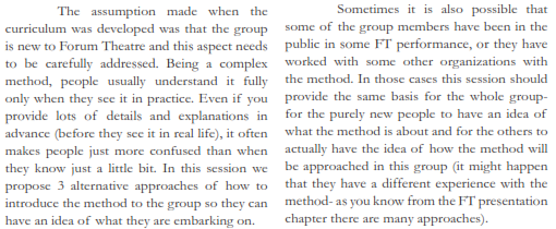 In the Forum Theatre process the focus is not on developing high theatrical skills and therefore the time allocated for such kind of preparation might look shorter comparing with the professional groups.