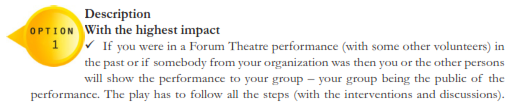 If at that time your organization is performing a forum theatre play in the community – you can invite the group there and in this session you can have a discussion based on their experience as members of the public.