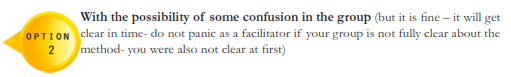 Briefly introduce this part and remind them about the fact that it is planned to be an experiential approach and they should let themselves go with the process – and after the games we will discuss their experience