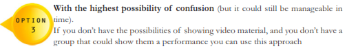 You can also improvise a performance with the more experienced volunteers from your organization – just with the purpose of showing it to your group.