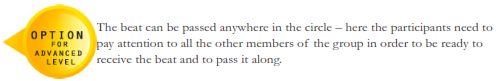 The group stands in a circle; the facilitator explains that this exercise will be done in silence and has eye contact as a key element. The facilitator can start by “passing the beat” which in fact represents a clap – 2 people look into each other’s eyes and they have to clap (their own hands) at the same time-so we can hear only 1 clap and not 2. The beat will be passed on in the circle from person to person – trying to keep the same rhythm and play with it – to become faster or slower. The first round (a complete circle) will be more of a trial round until the participants get in the mood-then more beats could be introduced – all the time trying to synchronize with the rhythm developed.
