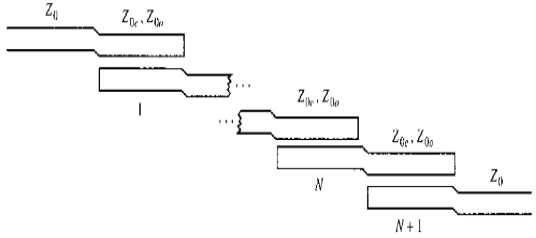 A general layout of a parallel coupled microstrip bandpass is shown in figure 3.1 . The filter structure consists of open circuited coupled microstrip lines . These coupled lines are quarter wavelength , (λ/4) long and are equivalent to shunt resonant circuits. The coupling gaps correspond to the admittance inverters in the low-pass prototype circuit. Even- and odd- mode characteristic impedances of parallel-coupled half-wave resonators are computed using admittance inverters. These even- and odd- mode impedances are then used to compute physical dimensions of the filter. Now consider a bandpass filter composed of a cascade of N + 1 coupled line sections, as shown in Figure 3.1. The sections are numbered from left to right, with the load on the right, but the filter can be reversed without affecting the response. Since each coupled line section has an equivalent circuit of the form, the equivalent circuit of the cascade is as shown in Figure 3.2.