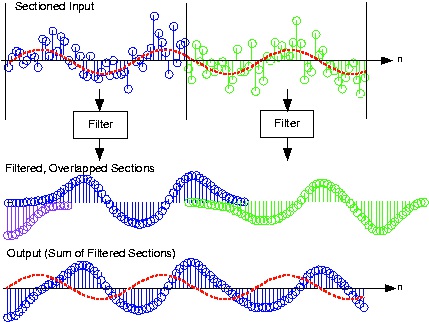 input into frames, filter each, and add the results together. To section a signal means expressing it