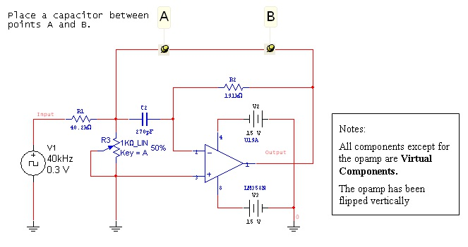 Select the virtual capacitor from the In-Use List and place it between Points A and B in the circuit. Notice the how it is automatically connected, and has a capacitance of 270 pF.