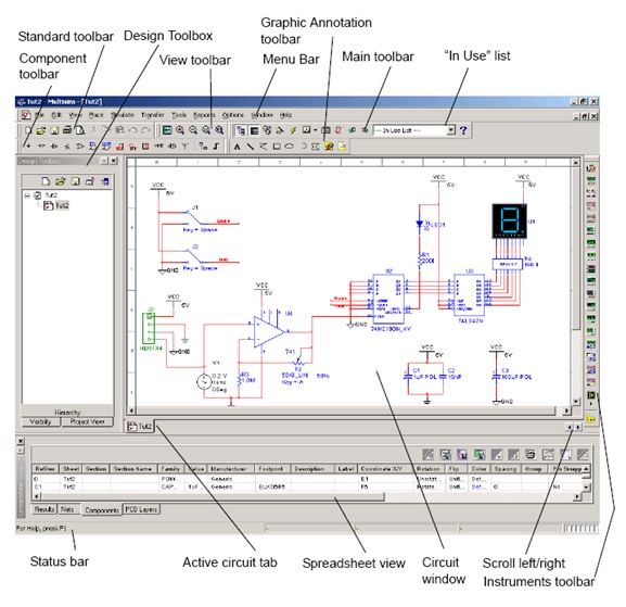 Multisim’s user interface consists of the basic elements, illustrated in Figure 1 below.
