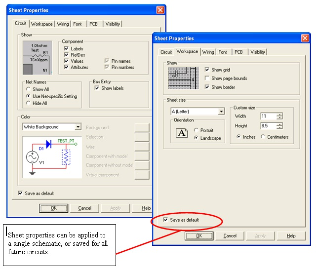 The Sheet Properties dialog box is used to set up the preferences for each sheet. These preferences are saved with the circuit file so that if the circuit is opened on another computer, it will use the same settings.
