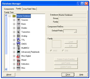 Database management tools are supplied in order to move components between databases, merge databases, and edit them. All the databases are divided into groups and then into families within those groups. When a designer chooses a component from the database and drops it onto the circuit, a copy of the component is placed onto the circuit. Any edits made to the component in the circuit do not affect the original database copy.