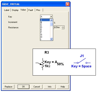 For the components shown in Figure 2 below, pressing the A keywill increase the resistance of the potentiometer toward 100% of the shown value (1kΩ); to decrease the resistance, hold the Shift key then press the A key. Pressing the Spacebar will toggle the switch to be either closed or open.