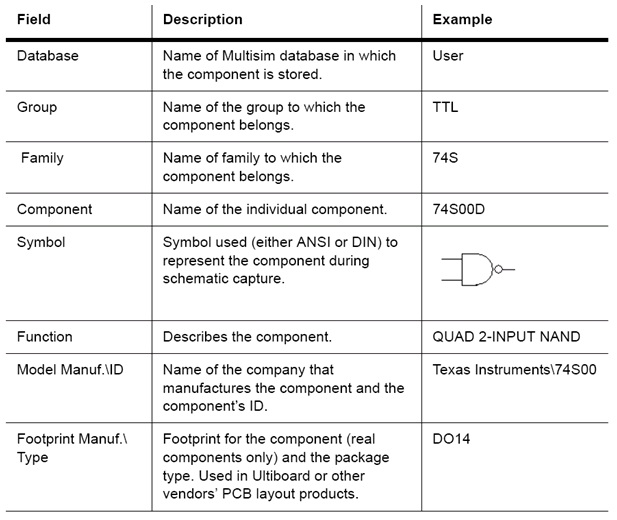 The Component Browser shows the current database in which the displayed parts are stored. Multisim organizes the parts by group, and family. The browser also shows the symbol, a description of the component in the Function field, the model, and the footprint / manufacturer.