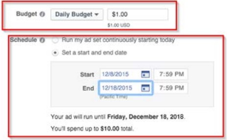 Start with spending $1/day for around two weeks. As you learn more about how your ads perform, you can adjust your budget and scheduling as needed.