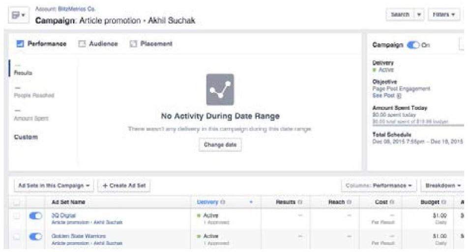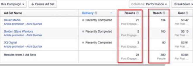 Check the Campaign folder every few hours until the ad’s run ends to see the performance for each ad set. You’ll be able to track metrics such as post engagement, the number of people reached, and your ad spend.