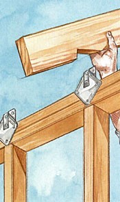 Fasten the bottom ends of the common rafters to the wall plates with metal anchors.