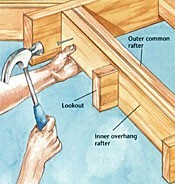 Attach lookouts to four of the overhang rafters, then nail the overhang rafters to the outer common rafters.