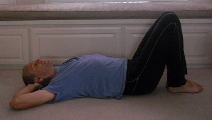 Our next pose is “Upward Stretched Legs” and is approached by lying on your back with the knees bent and pointing towards the ceiling. Hands are by the side with palms facing down.