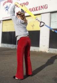 Here is a close-up picture of the strap attached to a harness (instead of a weight lifting belt):