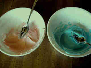 FEW DROPS OF COLOUR ADDED TO PLAIN FROSTING Now divide the frosting in two separate bowls.
