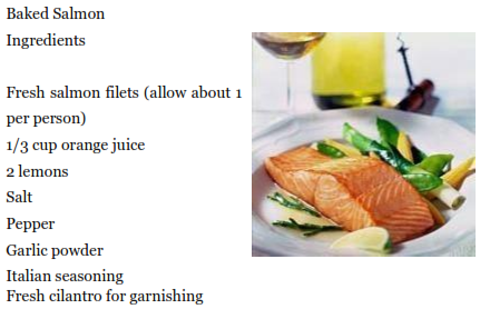 Mix 1/3 cup orange juice with the juice of one of the lemons; pour mixture over salmon filets in baking dish