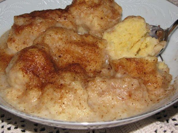 Remove the dumplings with a slotted spoon and arrange in a serving dish. Sprinkle generously with cinnamon sugar (you will need more than you think, because the batter is not sweetened) and drizzle with the butter.