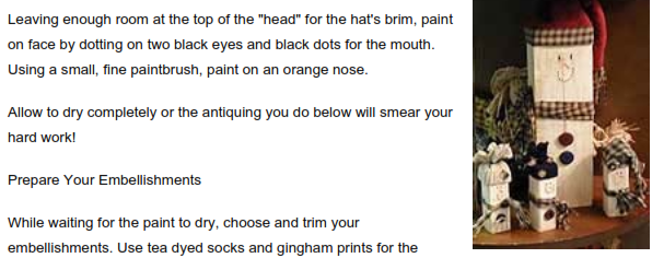 antiqued snowmen, use traditional primary colors, or the popular ice blue, for your white snowmen. Fringe the ends of your scarves with sharp fabric scissors, string small pieces of raffia through button holes and tie in knots or bows, cut small scraps for patches, trim the feet off of children's socks and fringe ankle ends for hats.