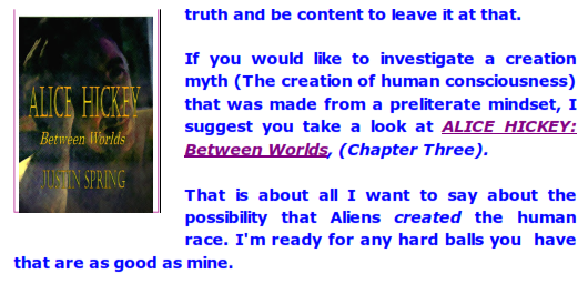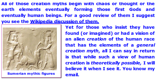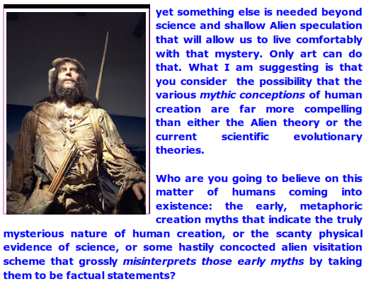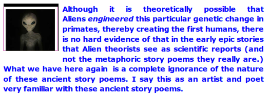 I thus see it as highly improbable that such an alien/human creation theory will ever gather enough hard evidence to outweigh the current scientific theory on the natural evolution of the human species. For one thing, the Alien theorists have never defined what being human means, i.e., have never defined the exact nature of the genetic change. What kind of thinking is that? I'll tell you what kind it is: sloppy thinking.