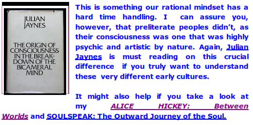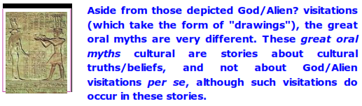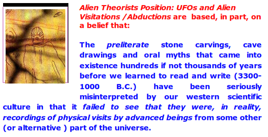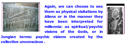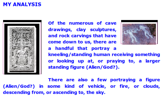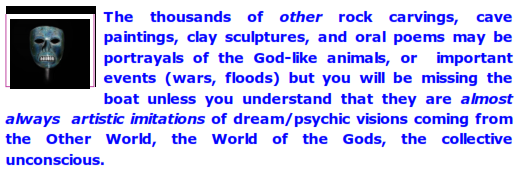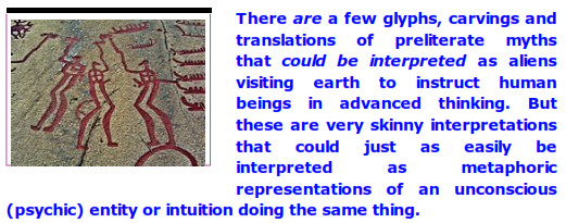 My own experiences with intuition makes me favor the interpretation of these preliterate "aliens creating/teaching human" glyphs as metaphoric representations of the arrival of an insight. After all, that is the way the preliterate mind operated: it expressed (and interpreted) events in terms of art ( oral story poems, drawings, carvings, etc.) which are metaphoric by their nature.
