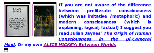 What writing changed for the Greeks was not native intelligence, but how they looked at themselves and the world, i.e., the Greeks experienced a true, very rapid evolutionary change in the nature of their consciousness, not their intelligence. I'll say more about this later.
