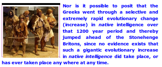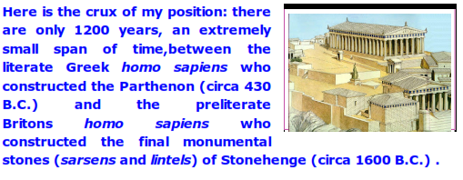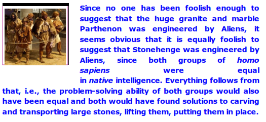 But what is important in my comparison of the Stonehenge Britons and the Parthenon Greeks is that both cultures (Greeks, Britons) had the same native intelligence when it came to solving the intricacies of quarrying, transporting, carving, lifting and moving very large stones.