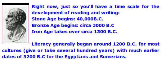 The native intelligence of the Greeks didn’t increase or change between Mycenean Greece and the Greece of the Parthenon. What changed was the way the Greeks looked at the world because of literacy, i.e., they began to examine the world logically and record everything around them. This logical, examining way of knowing the Greeks termed logos knowing. Needless to say, the knowledge that came with literacy grew slowly at first then like a chain reaction until it was encyclopedic by 430 B.C. (500 years after the advent of Greek literacy.)
