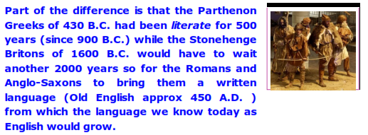 What did happen to the Greeks, however, was that they learned how to read and write before constructing the Parthenon and and the Britons didn't before constructing Stonehenge.